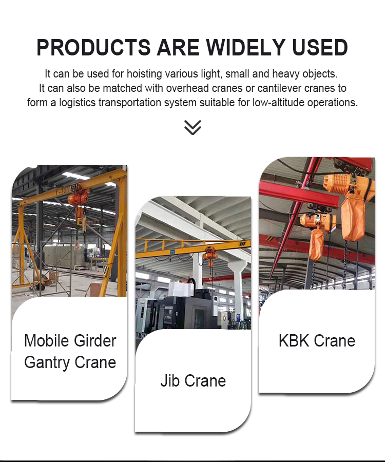 Električni pulley lanac blok dizalica koristiti širok raspon, uglavnom se koristi u velikim tvornicama, skladištima, proizvodnji energije vjetra, logistika, dokovi, građevinske i druge industrije